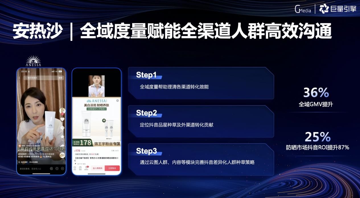 美妝行業(yè)的安熱沙作為防曬品牌頭部品牌,一直以來在多平臺(tái)均有生意布局,并觀察到抖音營(yíng)銷投入對(duì)其他平臺(tái)生意增長(zhǎng)的顯著外溢價(jià)值。今年618,安熱沙力求厘清在此前度量體系中忽視的外溢價(jià)值,深度運(yùn)用全域度量模塊和增效洞察模塊,研究抖音品星種草以及外渠道的轉(zhuǎn)化貢獻(xiàn),從而科學(xué)制定抖音差異化人群種草策略。最終,安熱沙全域GMV提升36%,抖音的ROI提升25%。