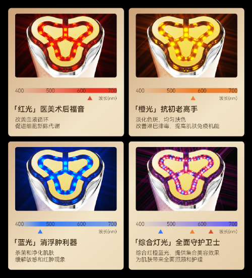 比如波長(zhǎng)較長(zhǎng)的紅光可以穿透真皮層,促進(jìn)血液循環(huán)、皮膚細(xì)胞新陳代謝;藍(lán)光可以消炎殺菌,精華肌膚,緩解皮膚敏感和紅腫現(xiàn)象;橙光可以淡化色斑,均勻膚色,提高肌膚免疫機(jī)能。
