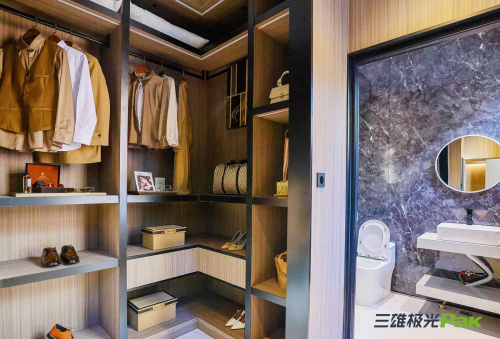 品牌體驗(yàn)館打造酒店套房、博物館長(zhǎng)廊、吧臺(tái)休閑等主題情景體驗(yàn)區(qū),給予來(lái)訪者沉浸式體驗(yàn)。其中,酒店套房情景體驗(yàn)區(qū)涵蓋臥室、書(shū)桌、衣帽間、衛(wèi)生間等空間,通過(guò)燈光、窗簾、音箱聯(lián)動(dòng)控制,營(yíng)造智能與生活場(chǎng)景融合的現(xiàn)代化居住體驗(yàn)。