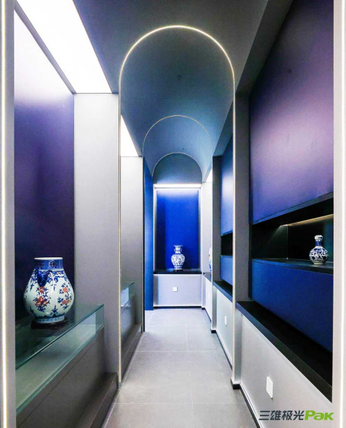博物館長(zhǎng)廊運(yùn)用線性照明強(qiáng)調(diào)空間縱深感,搭配智能控制方式,在長(zhǎng)廊內(nèi)逐一點(diǎn)亮展品,使其成為“吸睛點(diǎn)”,令大家自然而然地進(jìn)入觀展氛圍。