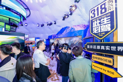 在工業(yè)復古與摩登時尚交匯融合的北京751火車頭廣場,京東方通過8K裸眼3D、MLED、超大尺寸透明OLED等頂尖顯示技術(shù)在O_SPACE展館內(nèi)打造了一座虛實融合的沉浸式自然風光影像館,館內(nèi)通過實景搭建與顯示科技相融合,將“此生必駕”的國民公路G318的四季之美創(chuàng)意呈現(xiàn),觀眾一進入展區(qū)就會被林芝的花開鳥鳴、羊湖的牧群山巒、珠峰的雪嶺碧空與布達拉宮的雄偉壯闊所震撼。