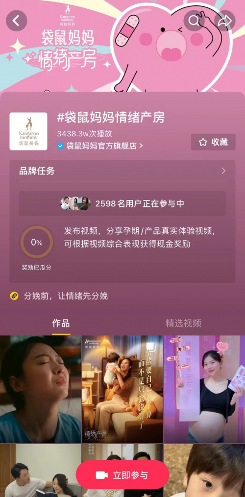 回歸品牌產(chǎn)品,袋鼠媽媽發(fā)起了主題為袋鼠媽媽「情緒產(chǎn)房」的全民挑戰(zhàn)賽,定向邀請(qǐng)用戶參與“淡定當(dāng)媽沒紋題”為主題的內(nèi)容創(chuàng)作中來,話題發(fā)出當(dāng)天已吸引了兩千多名抖音用戶參與,話題播放量達(dá)兩千萬。