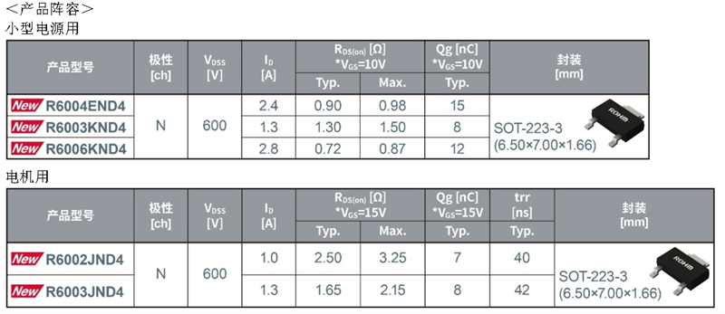 近年來,隨著照明用的小型電源和電泵用電機(jī)的性能提升,對(duì)于在這些應(yīng)用中發(fā)揮開關(guān)作用的MOSFET的更小型產(chǎn)品需求高漲。通常,對(duì)于Super Junction MOSFET而言,在保持高耐壓和低導(dǎo)通電阻特性理想平衡的同時(shí),很難進(jìn)一步縮小體積。此次,ROHM通過改進(jìn)內(nèi)置芯片的形狀,在不犧牲以往產(chǎn)品性能的前提下開發(fā)出5款更小更薄的SOT-223-3封裝新產(chǎn)品。
