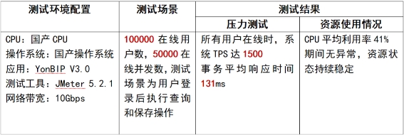 測試報告顯示,在YonBIP3應(yīng)用下,金倉數(shù)據(jù)庫KingbaseES V8和V9性能表現(xiàn)優(yōu)異。100000在線用戶數(shù),50000在線并發(fā)用戶數(shù)的應(yīng)用場景下,業(yè)務(wù)系統(tǒng)的組織建設(shè)、權(quán)限建立、檔案管理、采購流程、銷售流程、現(xiàn)金管理、固定資產(chǎn)、總賬、賬表查詢等基礎(chǔ)業(yè)務(wù)共計幾十項功能全部通過驗證。同時,所有用戶在線時系統(tǒng)TPS值達1500!同比友商在相同環(huán)境下的鑒定結(jié)果,在線用戶數(shù)提升3.3倍,在線并發(fā)數(shù)提升5倍,系統(tǒng)TPS提升50%!達到業(yè)界領(lǐng) 先水準!