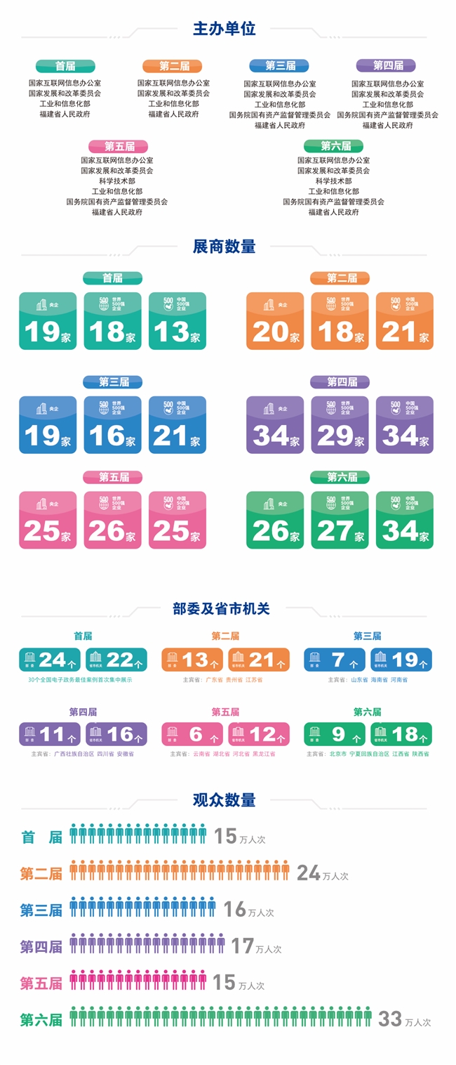 數(shù)字中國(guó)建設(shè)成果展覽會(huì)舉辦六年以來(lái),全國(guó)34個(gè)省 (自治區(qū)、直轄市)和港澳臺(tái)地區(qū)的政 府、機(jī)構(gòu)或企業(yè)代表均積極參展。國(guó)家部委機(jī)關(guān)累計(jì)參展達(dá)70次。央企、世界500強(qiáng)、中國(guó)500強(qiáng)等實(shí)力企業(yè)積極參展,展覽規(guī)模逐年遞增。