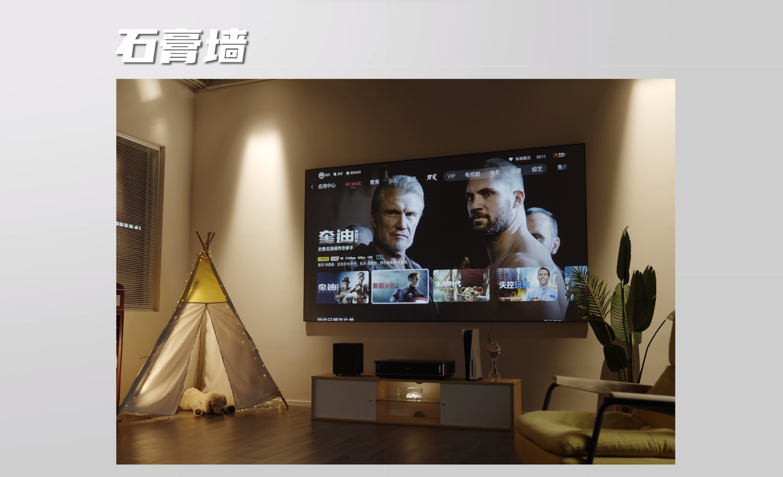 別看L5K擁有超百吋的屏幕,120英寸的屏幕重量卻只有21公斤,是同等尺寸液晶電視重量的五分之一。無論客廳墻面是藝術(shù)墻、龍骨墻、石膏墻還是巖板墻,它都一視同仁、來者不拒,通通都能“裝”,留足裝修自由。