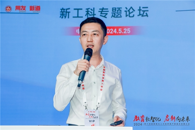 新道科技股份有限公司新工科事業(yè)部副經(jīng)理、工業(yè)互聯(lián)網(wǎng)領(lǐng)域?qū)<抑芎グl(fā)表題為“場景融合‘工業(yè)互聯(lián)網(wǎng)’教學(xué)——基于用友產(chǎn)業(yè)的工業(yè)互聯(lián)網(wǎng)人才培養(yǎng)解決方案”的主題演講。他指出,新質(zhì)生產(chǎn)力已成為當(dāng)前制造業(yè)數(shù)智化轉(zhuǎn)型的方向,產(chǎn)教融合是新工科數(shù)智化人才培養(yǎng)的必然選擇?;谟糜选熬恰惫I(yè)互聯(lián)網(wǎng)臺(tái)服務(wù)中國和全球工業(yè)企業(yè)數(shù)智化的產(chǎn)業(yè)優(yōu)勢,新道新工科工業(yè)互聯(lián)網(wǎng)教育以產(chǎn)業(yè)鏈對接教育鏈,以“新一代信息技術(shù)+工業(yè)互聯(lián)網(wǎng)”的創(chuàng)新人才培養(yǎng)模式賦能新工科。