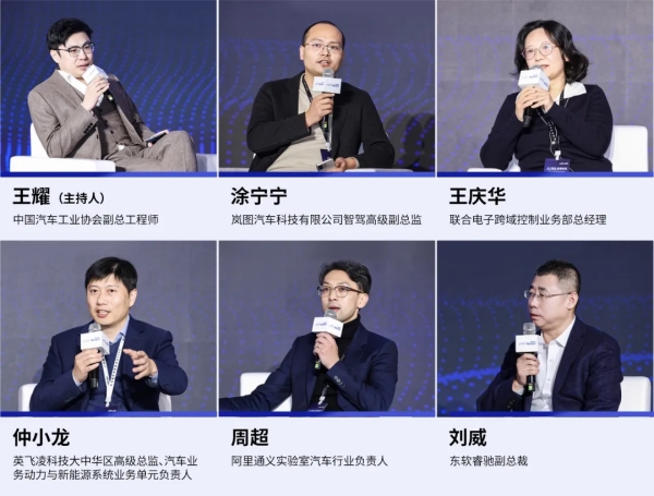 圓桌討論環(huán)節(jié),中國汽車工業(yè)協(xié)會副總工程師王耀,嵐圖汽車科技有限公司智駕高級副總監(jiān)涂寧寧,聯(lián)合電子跨域控制業(yè)務(wù)部總經(jīng)理王慶華,英飛凌科技大中華區(qū)高級總監(jiān)、汽車業(yè)務(wù)動力與新能源系統(tǒng)業(yè)務(wù)單元負(fù)責(zé)人仲小龍,阿里通義實驗室汽車行業(yè)負(fù)責(zé)人周超,東軟睿馳副總裁劉威共同圍繞“AIDV時代下,汽車軟件的生態(tài)融合與創(chuàng)新突破”主題進(jìn)行討論,探討AI定義汽車的未來趨勢,并結(jié)合實際案例提出生態(tài)融合的創(chuàng)新路徑,為AIDV 時代生態(tài)協(xié)同發(fā)展提供多元思路與深刻見解。