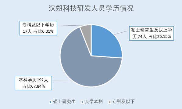 截至2024年6月30日,漢朔科技共有研發(fā)人員283人,占總?cè)藬?shù)的比例為31.76%。其中,碩士研究生及以上學歷研發(fā)人員占比26.15%,本科學歷研發(fā)人員占比67.84%。