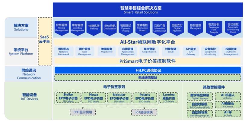 圍繞零售門店數(shù)字化領域,漢朔科技構(gòu)建了以電子價簽系統(tǒng)、SaaS云平臺服務等軟硬件產(chǎn)品及服務為核心的業(yè)務體系,面向零售行業(yè)客戶提供電子價簽系統(tǒng)等軟硬件一體化解決方案。