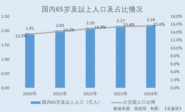 另據(jù)國統(tǒng)局數(shù)據(jù),2020-2024年,國內(nèi)65歲及以上人口分別為1.91億人、2.01億人、2.10億人、2.17億人、2.20億人,占當年度全國人口的比例分別為13.5%、14.2%、14.9%、15.4%、15.6%。