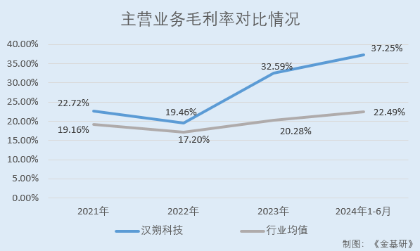 2021-2023年及2024年1-6月,漢朔科技的主營業(yè)務毛利率分別為22.72%、19.46%、32.59%、37.25%,高于行業(yè)均值。