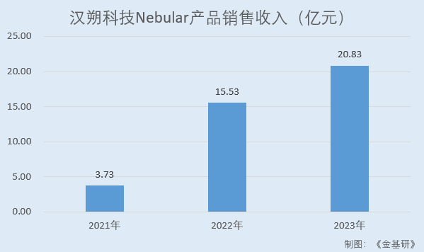 2020年,漢朔科技成功推出的新一代電子價簽Nebular獲得市場客戶的廣泛認可。2020-2023 年,漢朔科技Nebular產(chǎn)品銷售收入分別為0.10億元、3.73億元、15.53億元、20.83億元,年均復合增長率達到487.21%,占主營業(yè)務收入比例從0.95%增長至55.18%。