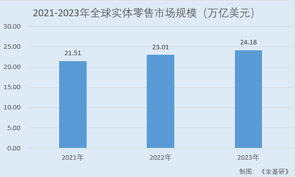 據(jù)eMarketer數(shù)據(jù),2021-2023年,全球?qū)嶓w零售業(yè)市場規(guī)模分別為21.51萬億美元、23.01萬億美元、24.18萬億美元。隨著經(jīng)濟生活常態(tài)化,未來全球?qū)嶓w零售業(yè)市場規(guī)模增幅將逐步恢復平穩(wěn),eMarketer預計2023-2027年間復合增長率約3%。