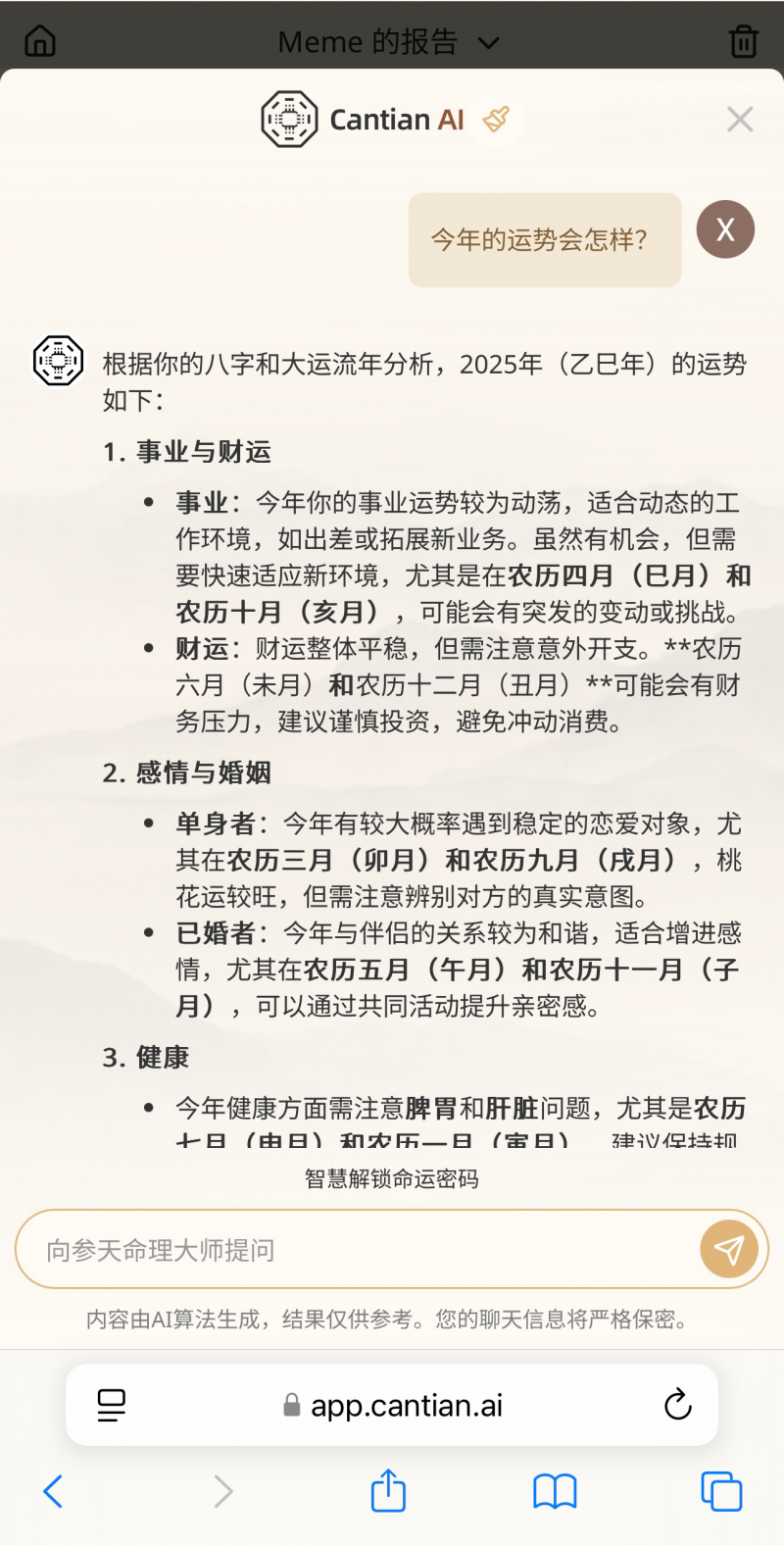 一位新加坡用戶輸入1990年3月15日8時30分后,系統(tǒng)生成中英文雙語報告:在“2025年傷官見官需防口舌”的警示下,AI結(jié)合其跨境電商背景,建議“三季度布局東南亞直播賽道”。這種將傳統(tǒng)術(shù)語轉(zhuǎn)化為行為指南的能力,支撐起平臺85%的歐美及東南亞用戶占比。
