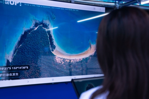 核心互動(dòng)裝置《共繪海岸線》突破傳統(tǒng)觀展模式。觀眾在屏幕上任意繪制曲線,AI系統(tǒng)將實(shí)時(shí)匹配全球真實(shí)海岸線輪廓——從海底珊瑚修復(fù)行動(dòng),到冰川消融下的生存危機(jī),每完成一筆繪制,即可解鎖一段由全球環(huán)保機(jī)構(gòu)提供的海洋保護(hù)影像故事。