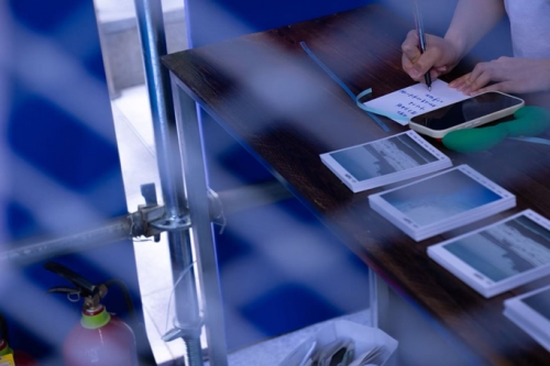 展覽首創(chuàng)公眾共創(chuàng)項(xiàng)目“共織一座島”。現(xiàn)場(chǎng)由MUJI提供的編織帶,是回收自海洋的“幽靈漁網(wǎng)”與海灘垃圾,經(jīng)再生工藝轉(zhuǎn)化為深淺不同的藍(lán)、褐、綠色織帶,代表著從陸地到海洋。