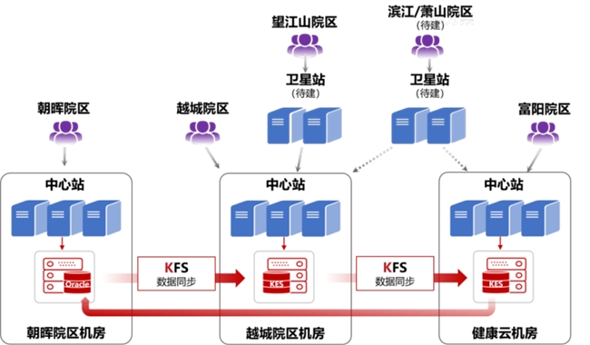 以浙江省人民醫(yī)院為例,目前該院下轄朝暉、越城、望江山、富陽四大已運行院區(qū),另有濱江、蕭山兩個在建院區(qū)及全面托管的八家分院,橫跨杭州紹興兩地。系統(tǒng)改造前浙江省人民醫(yī)院并存Oracle、SQL Server、MySQL、PostgreSQL等多種數(shù)據(jù)庫,100余個業(yè)務(wù)系統(tǒng)由多個軟件開發(fā)商承建。單一主院區(qū)承載核心系統(tǒng),故障時需手動拉起災(zāi)備,業(yè)務(wù)中斷風(fēng)險突出。這些醫(yī)院管理和一線業(yè)務(wù)上的剛需倒逼集團化醫(yī)院進行信息系統(tǒng)改造升級,歷史遺留因素給一體化管理帶來的困難也需要在此過程中逐步解決。