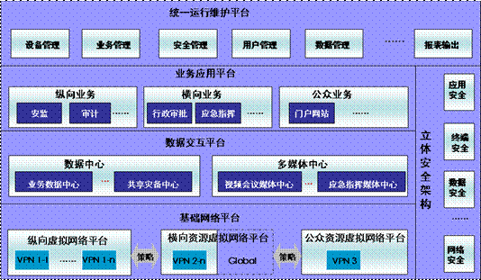 電子政務(wù)外部平臺整體模型包括基礎(chǔ)網(wǎng)絡(luò)平臺、數(shù)據(jù)交互平臺、業(yè)務(wù)應(yīng)用平臺、立體安全架構(gòu)、統(tǒng)一運(yùn)維與管理平臺5大模塊構(gòu)成。從模型中可以看出前期電子政務(wù)外網(wǎng)的建設(shè)重心基礎(chǔ)網(wǎng)絡(luò)平臺只是電子政務(wù)外部平臺的一個模塊,數(shù)據(jù)中心與災(zāi)備、立體安全架構(gòu)、統(tǒng)一運(yùn)行與維護(hù)管理等模塊也已成為用戶的重點(diǎn)需求。