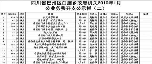 打開白廟鄉(xiāng)政府網(wǎng)站右側(cè)區(qū)域的“財(cái)務(wù)公示”欄,記者看到《白廟鄉(xiāng)2010年財(cái)政收入項(xiàng)目表》、《2010年政府機(jī)關(guān)開支公示欄》、《2010年民政兌現(xiàn)公示欄》等項(xiàng)目。在《2010年財(cái)政預(yù)算支出項(xiàng)目表》中,最引人注目的是《2010年政府機(jī)關(guān)開支公示欄》(右圖為其局部),其中提到了該鄉(xiāng)今年1月、2月整個(gè)鄉(xiāng)政府機(jī)關(guān)各項(xiàng)經(jīng)費(fèi)支出,內(nèi)容十分具體,老百姓關(guān)心的公款接待、公車消費(fèi)等都有相關(guān)明細(xì),如吃飯、煙酒、礦泉水、紙筆、紙杯、車費(fèi)等。最大的一筆開支是,1月24日招待“財(cái)務(wù)預(yù)算公開民主議事會觀摩來客”,請客三桌,花費(fèi)1269元,最小的一筆開支為“購買信紙”,花費(fèi)1.5元。金額、事由、發(fā)生時(shí)間、經(jīng)辦人、證明人、審批人、安排人都有說明。