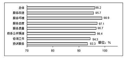 ?。?)在本次調(diào)查設(shè)置的“總體滿意度”、“服務(wù)質(zhì)量”、“服務(wù)態(tài)度”、“政務(wù)公開渠道”、“咨詢工作”、“投訴服務(wù)”、“服務(wù)環(huán)境”等多項(xiàng)指標(biāo)上,公眾滿意度都在九成三以上,呈現(xiàn)出比非政務(wù)中心窗口更高的水平,其中,總體滿意度高達(dá)96.2%(見下圖);在“服務(wù)改進(jìn)情況”指標(biāo)上,53.7%的受訪者認(rèn)為政務(wù)中心窗口“有很大改進(jìn)”,高出非政務(wù)中心窗口13.3個(gè)百分點(diǎn)。