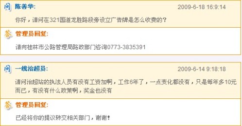 廣西壯族自治區(qū)公路管理局網(wǎng)站留言咨詢板塊的對話