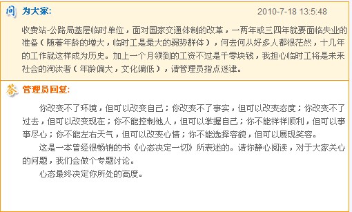 有這樣一條就讓人感觸頗深,網(wǎng)友“為大家”問道:收費站是公路局基層臨時單位,面對國家交通體制的改革,一兩年或三四年就要面臨失業(yè)的準(zhǔn)備,何去何從好多人都很茫然,請管理員指點迷津。管理員的回答說“你改變不了環(huán)境,但可以改變自己;你改變不了事實,但可以改變態(tài)度,心態(tài)最終決定你所處的高度。”