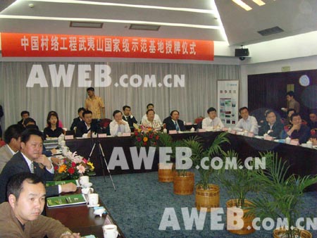 授牌儀式由武夷山市政府常務副市長金益滿主持,武夷山市胡書仁市長致歡迎辭,林嘉騋副會長、曹鴻鳴秘書長分別代表中國扶貧開發(fā)協(xié)會、中國致公黨中央致賀詞,“數字武夷”信息化領導小組辦公室劉德水主任就武夷山市新農村信息化建設情況做了題為“政府推動、特色服務、多元參與、商務運營”的專題報告。與會領導及嘉賓還參觀了武夷山游客服務中心以及示范基地示范點--星村村信息服務站,并對中國村絡工程的試點工作提出了很多寶貴的意見和建議。