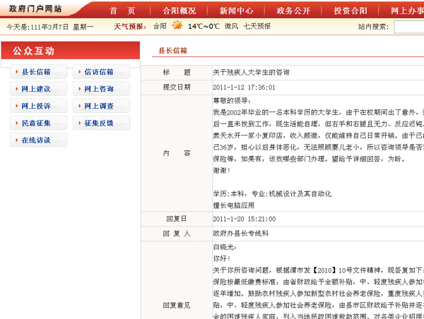 這是合陽縣政府網(wǎng)站“縣長信箱”內(nèi)的一條留言與回復(fù)(網(wǎng)絡(luò)截圖)。陜西一個原本不起眼的小縣城合陽目前已成為網(wǎng)上網(wǎng)下熱點(diǎn),這個縣的政府網(wǎng)站由于對網(wǎng)民的咨詢和投訴件件有回復(fù),被網(wǎng)民稱作“最敬業(yè)的縣政府網(wǎng)站”。由于去“圍觀”頂起的網(wǎng)民太多,一度導(dǎo)致這個縣政府網(wǎng)站“癱瘓”?!白罹礃I(yè)的縣政府網(wǎng)站”為何被頂起?一直在關(guān)注兩會進(jìn)程的網(wǎng)民說:因?yàn)樗鹬鼐W(wǎng)民意見,不擺空架子不作秀,事事有回應(yīng)。參加兩會的不少代表委員也指出,合陽縣的經(jīng)驗(yàn)表明,網(wǎng)絡(luò)問政必須由原來的網(wǎng)民單向表達(dá)變成政府與網(wǎng)民的雙向互動,“網(wǎng)民有所呼,政府有所應(yīng)”才能見到實(shí)效,才能得到群眾的擁護(hù)。