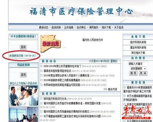 該網(wǎng)友提供的網(wǎng)頁截圖顯示,在福清市醫(yī)療保險管理中心網(wǎng)站左上角的“IC卡余額查詢”一欄中,數(shù)據(jù)更新日期赫然寫著“08-04-28”。