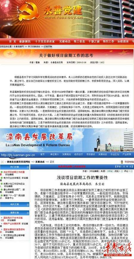 領(lǐng)導(dǎo)講話(huà)稿、工作經(jīng)驗(yàn)介紹……這些類(lèi)型的文章,撰稿人隨手上網(wǎng)“百度”或者“谷歌”一下,信手拈來(lái)估計(jì)是常有的事情,這大概也算公文寫(xiě)作的潛規(guī)則之一??戳T“灤南縣發(fā)展改革局網(wǎng)站”和“永善縣發(fā)展改革局網(wǎng)站”的雷同項(xiàng)目分析工作文章,我們驚恐地發(fā)現(xiàn)雷同的新版本已經(jīng)誕生。