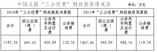 中國文學(xué)藝術(shù)界聯(lián)合會(huì)(包括中國文聯(lián)機(jī)關(guān)及各全國文藝家協(xié)會(huì)等13家所屬單位)2011年“三公經(jīng)費(fèi)”財(cái)政撥款預(yù)算1067.66萬元,其中:因公出國(境)費(fèi)540.00萬元,主要用于出訪國(境)外進(jìn)行文化交流、文化合作、組織展覽、展映、演出等對(duì)外文化宣傳交流活動(dòng)支出;公務(wù)用車購置及運(yùn)行費(fèi)408.16萬元,主要用于公務(wù)用車購置、保險(xiǎn)、維修保養(yǎng)、汽油等支出;公務(wù)接待費(fèi)119.50萬元,主要用于國內(nèi)外接待活動(dòng)中發(fā)生的必要支出。