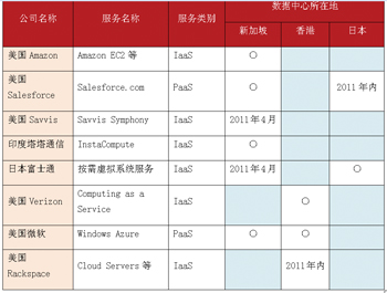 新加坡與香港正在成為亞洲云計算的中轉(zhuǎn)站。美國的Amazon、Salesforce、微軟等主要云計算服務(wù)提供商已經(jīng)利用新加坡與香港的數(shù)據(jù)中心面向亞洲提供服務(wù)。KDDI、NTT、富士通等日本IT供應(yīng)商也在加快在新加坡與香港的數(shù)據(jù)中心建設(shè)。索尼、雅馬哈電機、日本通運等企業(yè)用戶也將亞洲地區(qū)分支機構(gòu)的數(shù)據(jù)中心集中到了這兩個城市(表1)。