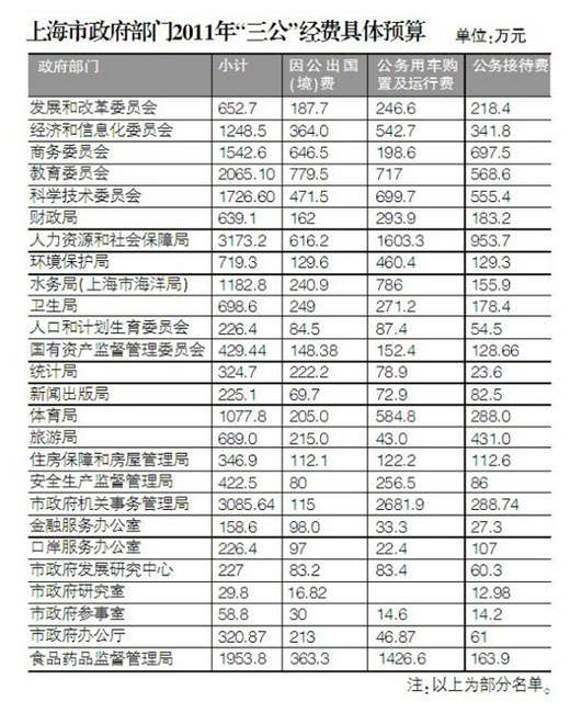 從市政府各部門公布的“三公”經(jīng)費(fèi)預(yù)算的情況來看,僅2011年上海市人民政府研究室“三公”經(jīng)費(fèi)預(yù)算“公務(wù)用車購置及運(yùn)行費(fèi)”一項(xiàng)并未有經(jīng)費(fèi)的支出預(yù)算。2011年7月28日召開的市十三屆人大常委會二十八次會議上,市財(cái)政局局長蔣卓慶受市政府委托,作了《關(guān)于上海市2010年市本級決算及2011年上半年預(yù)算執(zhí)行情況的報(bào)告》。經(jīng)市財(cái)政局匯總,2011年本市市級行政單位、事業(yè)單位和其他的單位用財(cái)政撥款開支的“三公”經(jīng)費(fèi)預(yù)算,合計(jì)11.1億元,其中,因公出國(境)經(jīng)費(fèi)預(yù)算1.95億元、公務(wù)用車購置及運(yùn)行費(fèi)預(yù)算5.85億元、公務(wù)接待費(fèi)預(yù)算3.3億元。有關(guān)本市市級部門“三公”經(jīng)費(fèi)預(yù)算向社會公開工作參照中央做法辦理。蔣卓慶說,下一階段,本市各級財(cái)政部門將加強(qiáng)財(cái)政預(yù)算和決算管理,深化細(xì)化財(cái)政信息公開。