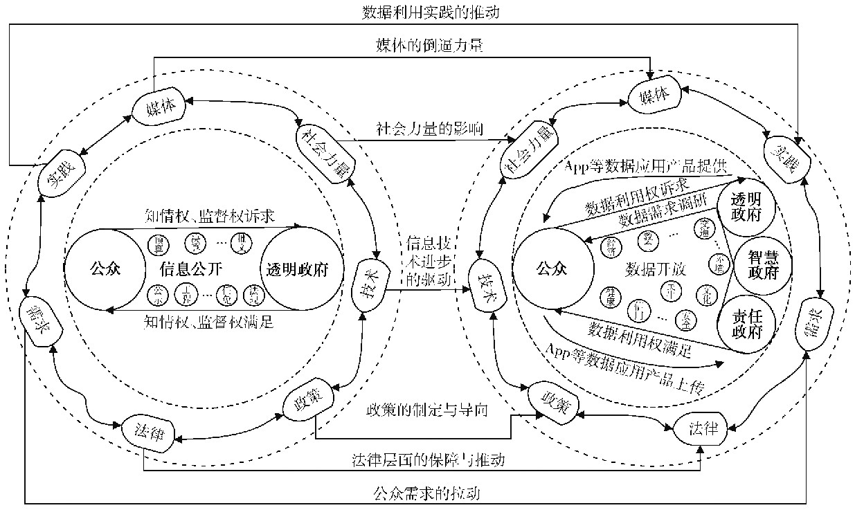 從圖2可以明顯看出, 信息公開(kāi)是在創(chuàng)建透明政府過(guò)程中, 行政機(jī)關(guān)為了滿足公眾的知情權(quán)和監(jiān)督權(quán), 將在履行職責(zé)過(guò)程中制作或獲取的以一定形式記錄、保存的信息向社會(huì)公眾公開(kāi)的活動(dòng), 包括預(yù)算、決算、批文、公示等形式。在實(shí)施政府信息公開(kāi)過(guò)程中, 受到法律、政策、技術(shù)等環(huán)境因素的影響, 這些環(huán)境因素也不是相互獨(dú)立的, 其間也是相互交叉關(guān)聯(lián)的, 正是由于這些因素隨著時(shí)代與歷史的向前發(fā)展不斷演進(jìn), 最終促使了信息公開(kāi)向數(shù)據(jù)開(kāi)放的嬗變。政府?dāng)?shù)據(jù)開(kāi)放是在創(chuàng)建透明政府、智慧政府和責(zé)任政府的過(guò)程中, 政府部門(mén)為了滿足公眾的數(shù)據(jù)利用權(quán), 對(duì)其在履行行政職能、管理社會(huì)公共事務(wù)過(guò)程中采集和儲(chǔ)存的大量原始數(shù)據(jù), 全部、及時(shí)并以開(kāi)放的格式永久免費(fèi)和免于授權(quán)地向公眾開(kāi)放, 并將公眾開(kāi)發(fā)上傳的數(shù)據(jù)產(chǎn)品繼而再提供給社會(huì)公眾使用, 推動(dòng)經(jīng)濟(jì)增長(zhǎng)和社會(huì)發(fā)展, 旨在培育良性循環(huán)的政府開(kāi)放數(shù)據(jù)生態(tài)圈。政府信息公開(kāi)向政府?dāng)?shù)據(jù)開(kāi)放嬗變過(guò)程是復(fù)雜的, 涉及的因素也是多樣的, 驅(qū)動(dòng)作用和機(jī)制更是復(fù)雜和往復(fù)的, 下面僅選擇關(guān)鍵且明顯的幾個(gè)方面進(jìn)行分析。