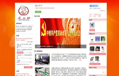 2011年3月1日,眉山市政府新聞辦分別注冊(cè)了“微眉山”、“微博東坡給力眉山”。截至2012年1月,全市官方微博數(shù)量已達(dá)22個(gè),黨政機(jī)關(guān)個(gè)人微博62個(gè),其中,“眉山交警”和“眉山工商”關(guān)注度達(dá)2萬(wàn)余人,“微眉山”的關(guān)注度更是高達(dá)15萬(wàn)余人,“粉絲”數(shù)量均居全省前列。