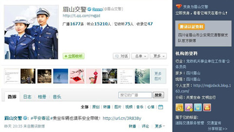 龍年春節(jié)期間,四川眉山市“微眉山”、“眉山交警”、“眉山氣象”等政務(wù)微博分別發(fā)布了數(shù)十條春運(yùn)服務(wù)信息,既滿足了群眾出行的需要,又充分體現(xiàn)了人性化關(guān)懷,備受群眾歡迎。