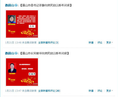 圖為眉山市委書記和市長(zhǎng)通過(guò)政務(wù)微博向網(wǎng)民朋友拜年的微博截圖