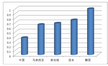 圖1 2010年中國(guó)、韓國(guó)、日本、新家坡、馬來西亞電子參與度比較
