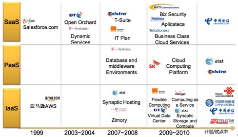 云計算的一個典型特征就是IT資源服務化,也就是將傳統(tǒng)的IT產品、能力通過互聯網以服務的形式交付給用戶。那么云計算主要包含哪些服務形式呢?通常的分類方法是分為IaaS(Infrastructure as a Service,基礎設施即服務)、PaaS(Platform as a Service,平臺即服務)和SaaS(Software as aService,軟件即服務),基本對應于傳統(tǒng)IT中的硬件、平臺和應用軟件。從下圖2云計算領域企業(yè)動態(tài)可知,目前大多數運營商主要最先從IaaS類服務進軍云計算。