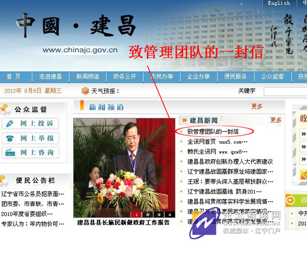 根據(jù)網(wǎng)友提供的線索,記者登陸了建昌縣政府網(wǎng)站,在首頁建昌新聞欄目中看到,8月3日分別出現(xiàn)了《致管理團(tuán)隊的一封信》等三篇文章?!吨鹿軋F(tuán)隊的一封信》一文出現(xiàn)了以下內(nèi)容: