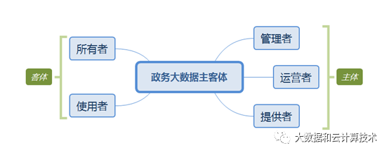 政務大數據的主客體,在類型上可以分為管理者、運營者、提供者、所有者和使用者。其中,管理者、運營者和提供者是廣義的服務提供者,是主體;所有者和使用者是廣義的服務使用者(被服務對象),是客體。主體和客體都是政務大數據服務的參與者,它們之間是服務與被服務的關系。在實際環(huán)境下,同一個主體或客體,往往具有管理者、運營者、提供者、所有者和使用者中兩個或兩個以上的多重角色。在本文中,重點從政務大數據服務的參與者來分析其主客體及相互關系。