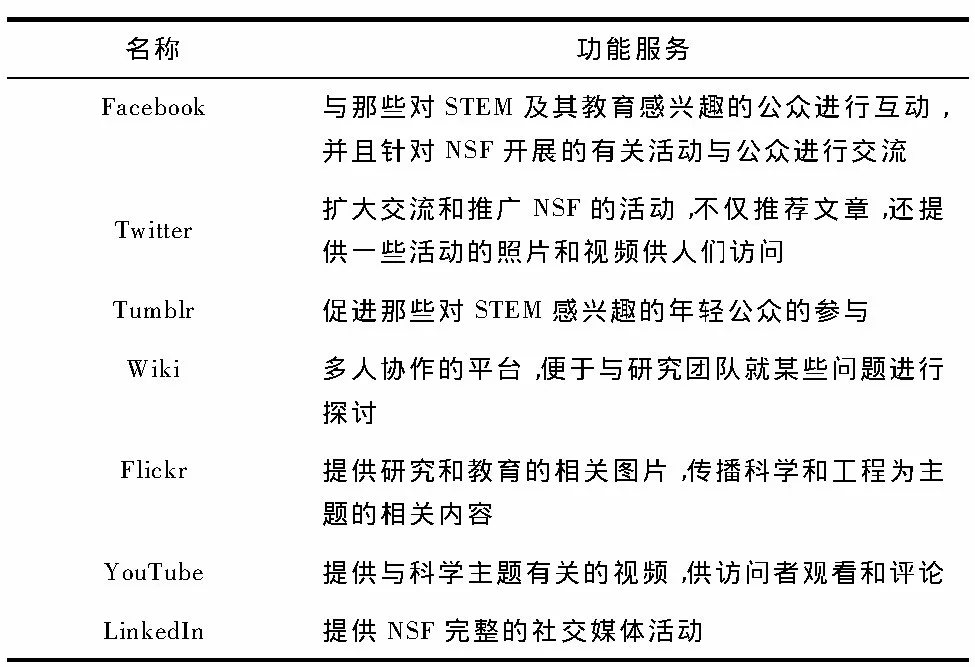 社交媒體是人們彼此之間分享意見(jiàn)和觀點(diǎn)的工具和平臺(tái),現(xiàn)階段的社交媒體主要包括各種社交網(wǎng)站、微博、微信、博客、論壇等。利用社交媒體技術(shù)可以推動(dòng)政府與公眾的對(duì)話,并為社會(huì)各方討論政府政策制定和實(shí)施提供機(jī)會(huì),促進(jìn)官民合作。以白宮的“we the people”請(qǐng)?jiān)妇W(wǎng)為例,該平臺(tái)為公眾聯(lián)合發(fā)起政策議題、參與聯(lián)邦政府政策的制定提供了重要途徑。美國(guó)國(guó)家科學(xué)基金會(huì)(The National Science Foundation,NSF)為促進(jìn)公眾參與的多元化,加強(qiáng)政府與公眾的溝通協(xié)作,構(gòu)建了多種社交媒體網(wǎng)站(見(jiàn)表2)。這些社交媒體工具極大地促進(jìn)了公眾的參與。