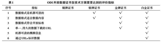 ODM的子項(xiàng)目,英國(guó)開(kāi)放數(shù)據(jù)研究所(Open Data Institute,ODI)開(kāi)發(fā)和維護(hù)的在線工具“開(kāi)放數(shù)據(jù)證書(shū)”(certificates.theodi.org),則是通過(guò)收集每個(gè)數(shù)據(jù)集的DCAT(Data Catalog Vocabulary)元數(shù)據(jù)評(píng)價(jià)其質(zhì)量和可信度,評(píng)價(jià)結(jié)果從低到高分為四類(lèi)證書(shū):銅牌、銀牌、金牌和白金證書(shū)。項(xiàng)目考察開(kāi)放數(shù)據(jù)集的法律、技術(shù)、社會(huì)和實(shí)踐四個(gè)方面的23個(gè)指標(biāo),“機(jī)器可讀的溯源信息”是技術(shù)方面的6個(gè)指標(biāo)之一,見(jiàn)表1。級(jí)別越高要求達(dá)到的指標(biāo)越多,“溯源”是最高級(jí)別的“白金證書(shū)”所必需的。