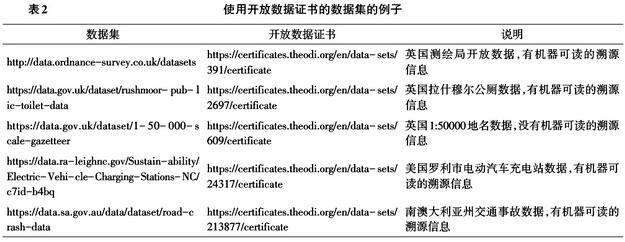 2013年11月1日頒布的《G8開(kāi)放數(shù)據(jù)憲章英國(guó)國(guó)家行動(dòng)計(jì)劃》規(guī)定NⅡ中的開(kāi)放數(shù)據(jù)集要經(jīng)歷“開(kāi)放數(shù)據(jù)證書(shū)”的評(píng)估過(guò)程。美國(guó)和澳大利亞等國(guó)的開(kāi)放數(shù)據(jù)門(mén)戶網(wǎng)站也采納了這項(xiàng)評(píng)估,用以向用戶推薦數(shù)據(jù)集。表2給出了來(lái)自三個(gè)國(guó)家的5個(gè)數(shù)據(jù)集的例子,它們均是銀牌證書(shū),其中4個(gè)有機(jī)器可讀的溯源信息,1個(gè)沒(méi)有。