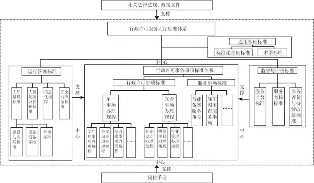 總結(jié)目前行政許可大廳開展服務(wù)標準體系建設(shè)的模式, 大體上分為三類:第一類是以服務(wù)標準化試點、社會管理和公共服務(wù)綜合標準化試點為契機, 開展標準化體系建設(shè), 依據(jù)是GB/T 24421系列標準即服務(wù)業(yè)組織標準化工作指南。第二類是以政務(wù)服務(wù)中心標準化工作指南要求, 建立的政府標準體系, 依據(jù)政務(wù)服務(wù)中心標準化工作指南第2部分:標準體系GB/T 32170.2-2015。第三類是地方標準化試點以及地方標準為依據(jù)開展的標準體系建設(shè), 例如天津、安徽等省市。