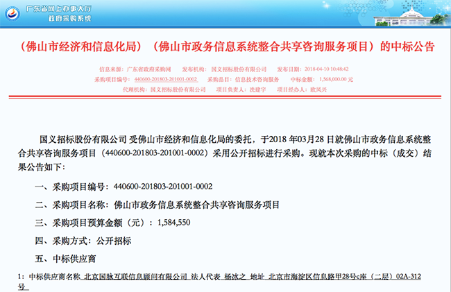 2018年4月10日,北京國脈互聯(lián)信息顧問有限公司成功中標(biāo)“佛山市政務(wù)信息系統(tǒng)整合共享咨詢服務(wù)項(xiàng)目”。