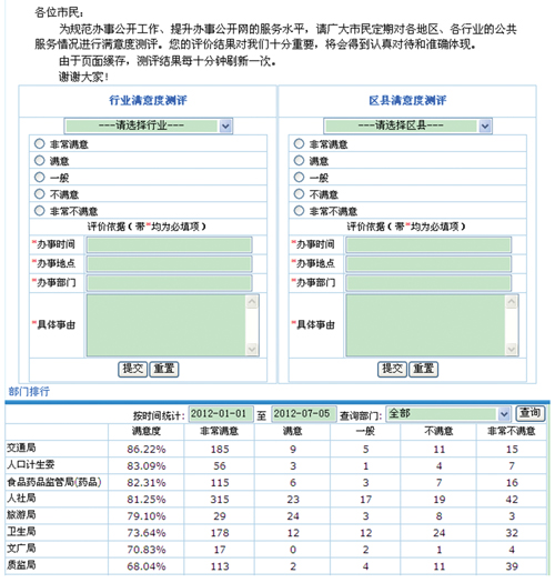 市民還可以對各行業(yè)和各地區(qū)辦事公開工作和日常辦事服務(wù)情況進(jìn)行滿意測評,測評結(jié)果由系統(tǒng)直接記錄并運行計算,滿意度數(shù)值在網(wǎng)站首頁顯著位置實時排行,通過“曬出”百姓的直接評價結(jié)果,建立起各單位的自我監(jiān)管和約束機(jī)制。