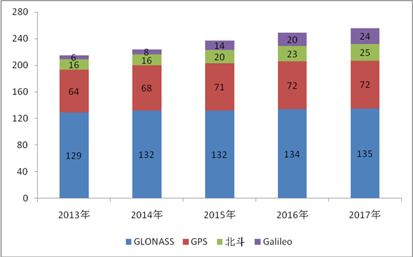 圖9 2013-2017年全球四大衛(wèi)星導(dǎo)航系統(tǒng)累計(jì)發(fā)射衛(wèi)星數(shù)