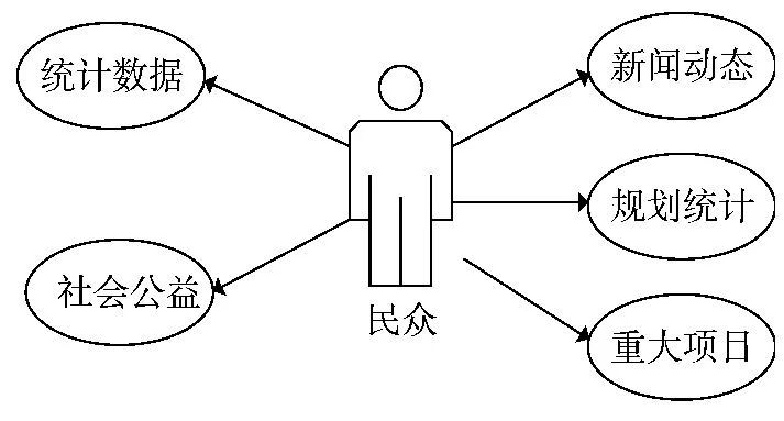 政務(wù)公開(kāi)模塊是政府部門(mén)通過(guò)本平臺(tái)實(shí)施“問(wèn)政于民”政策的一個(gè)窗口, 即有選擇性地將政府部門(mén)的一些日常政務(wù)信息向廣大民眾公開(kāi), 并接受民眾的監(jiān)督。參與政務(wù)公開(kāi)的用戶主體為部門(mén)用戶和民眾。政務(wù)公開(kāi)由新聞動(dòng)態(tài)、規(guī)劃計(jì)劃、重大項(xiàng)目、社會(huì)公益、統(tǒng)計(jì)數(shù)據(jù)和人事信息等子欄目組成。這些政務(wù)信息都是由所在部門(mén)用戶負(fù)責(zé)編輯完成的。其用例圖如圖2所示。